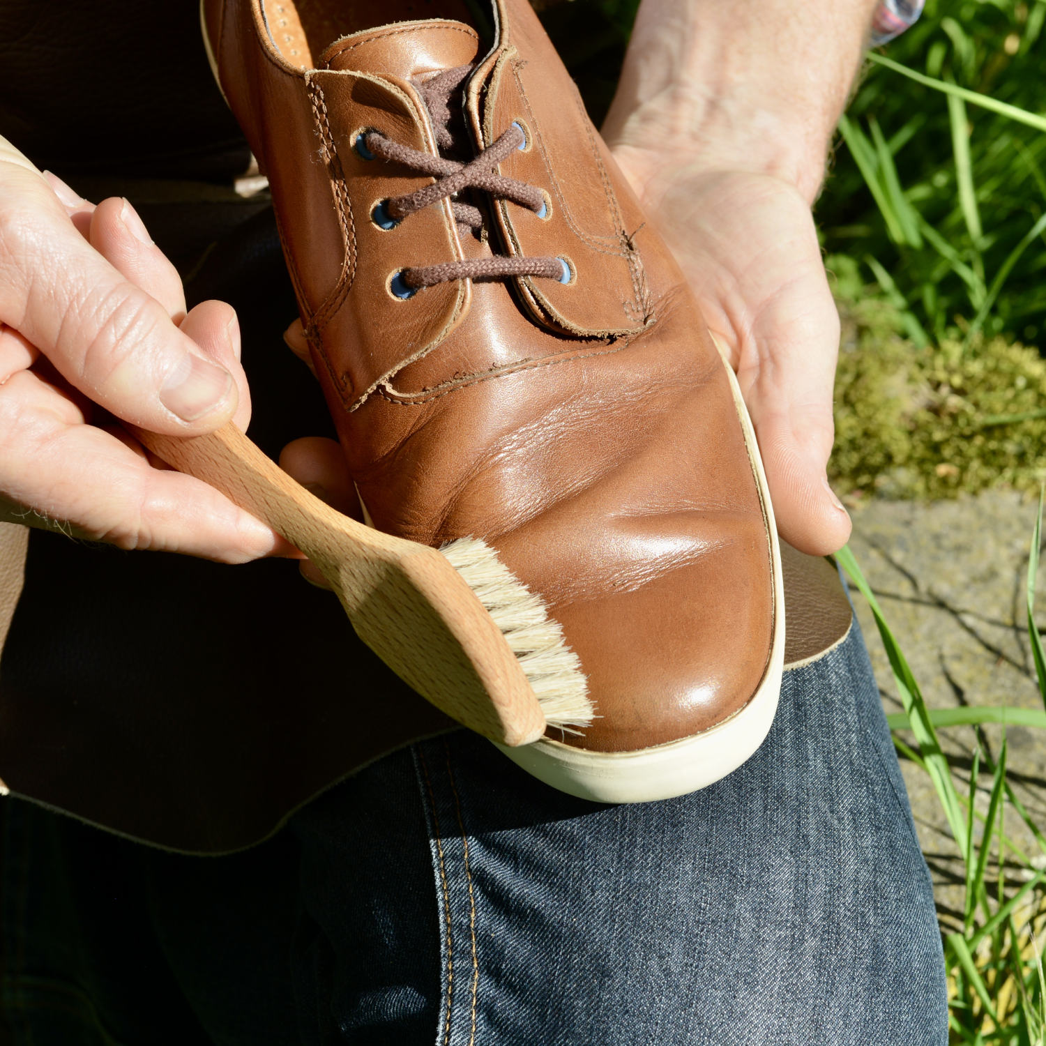 - Polieren: Nachdem die Pflege eingezogen ist, nehmen Sie die Tapir Göanzbürste und polieren Sie die Schuhe mit schnellen, glatten Bewegungen. Das Rosshaar der Bürste sorgt dabei für einen brillanten Glanz und eine gleichmäßige Verteilung der Pflegeprodukte.