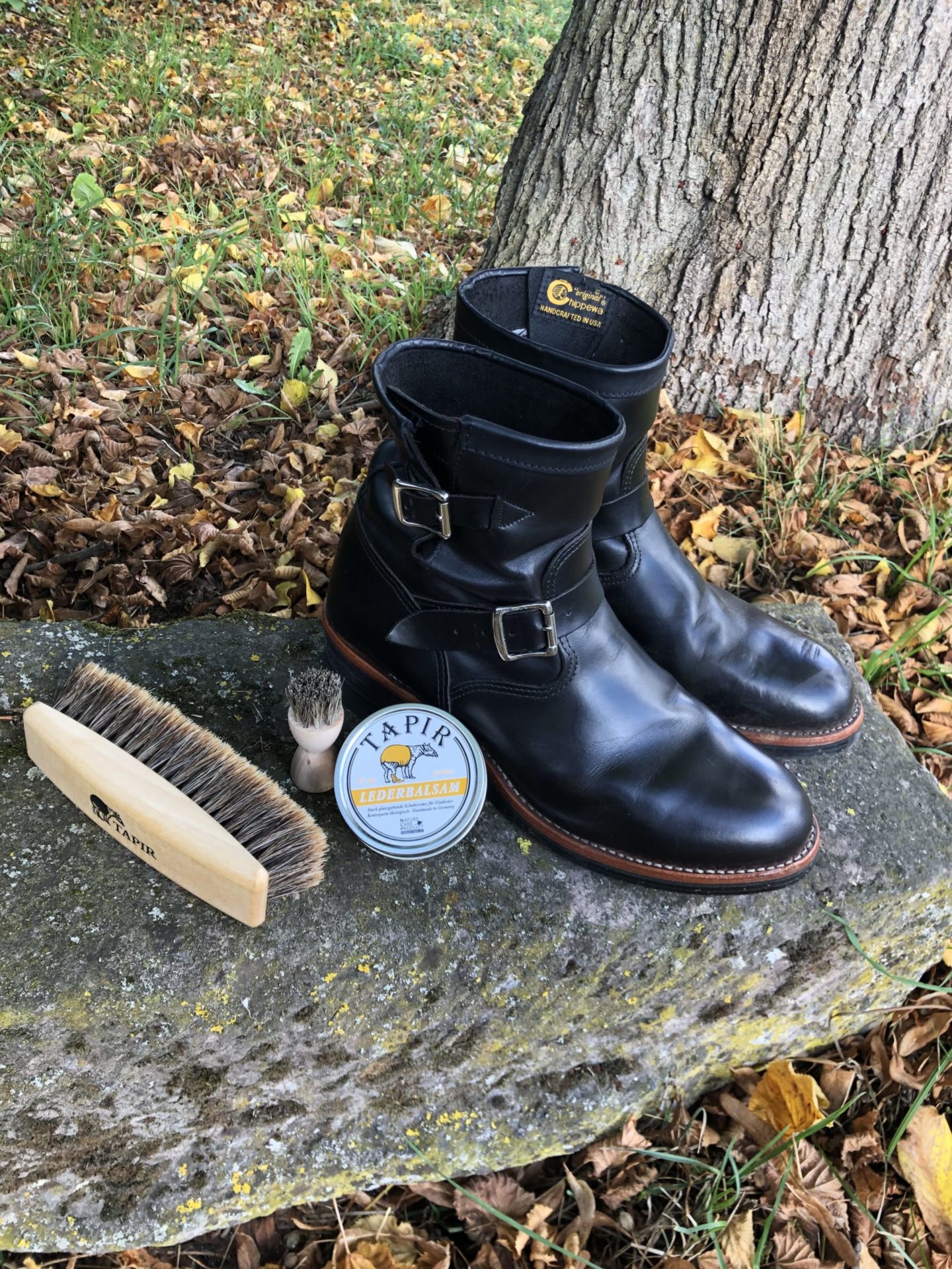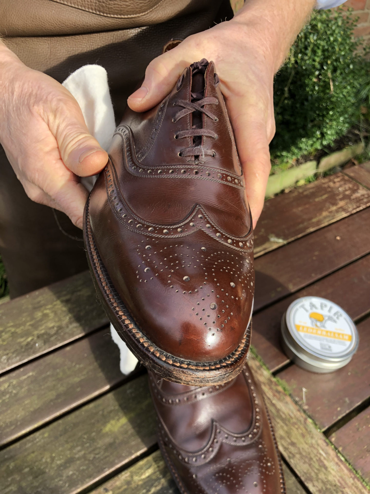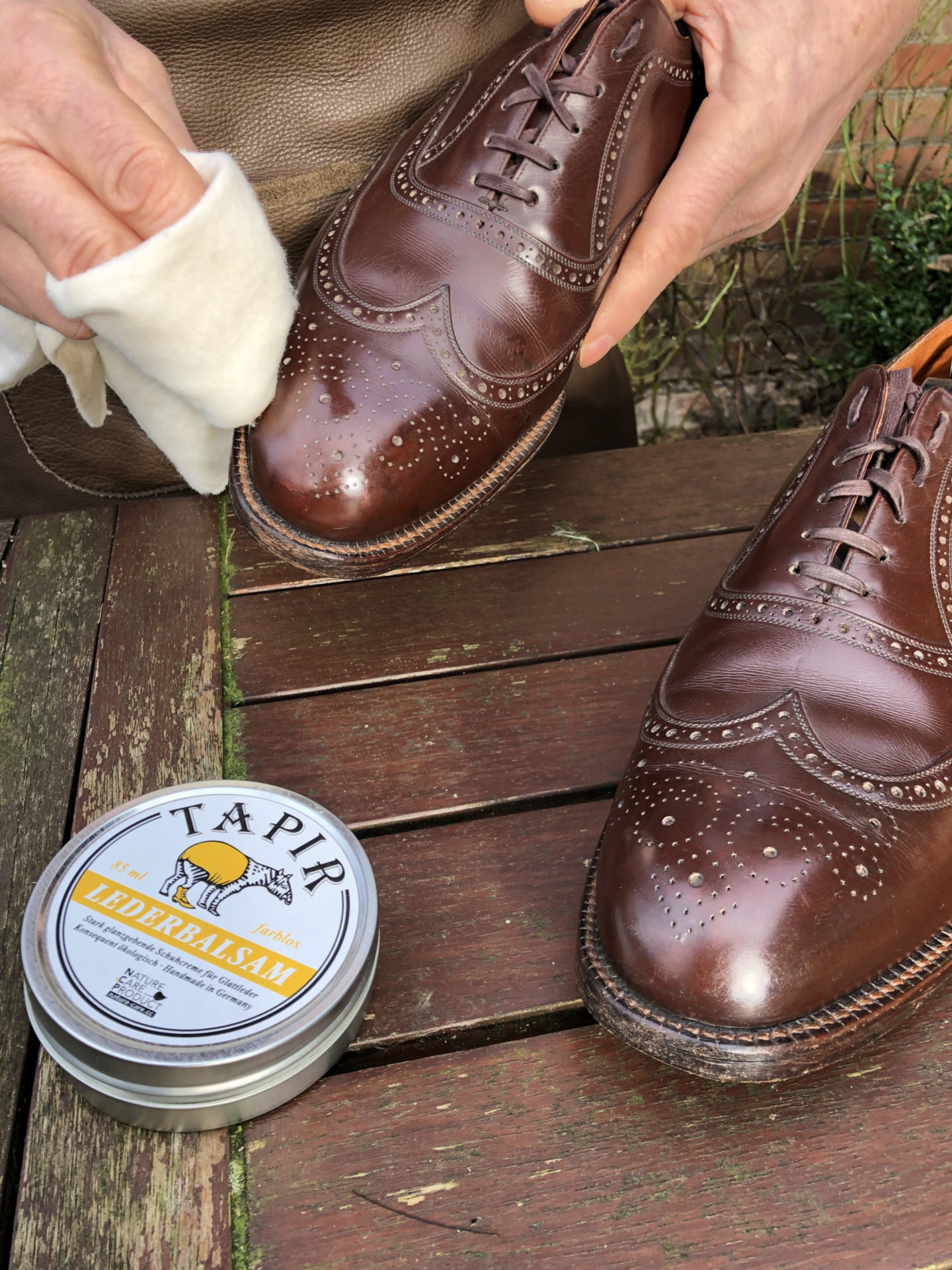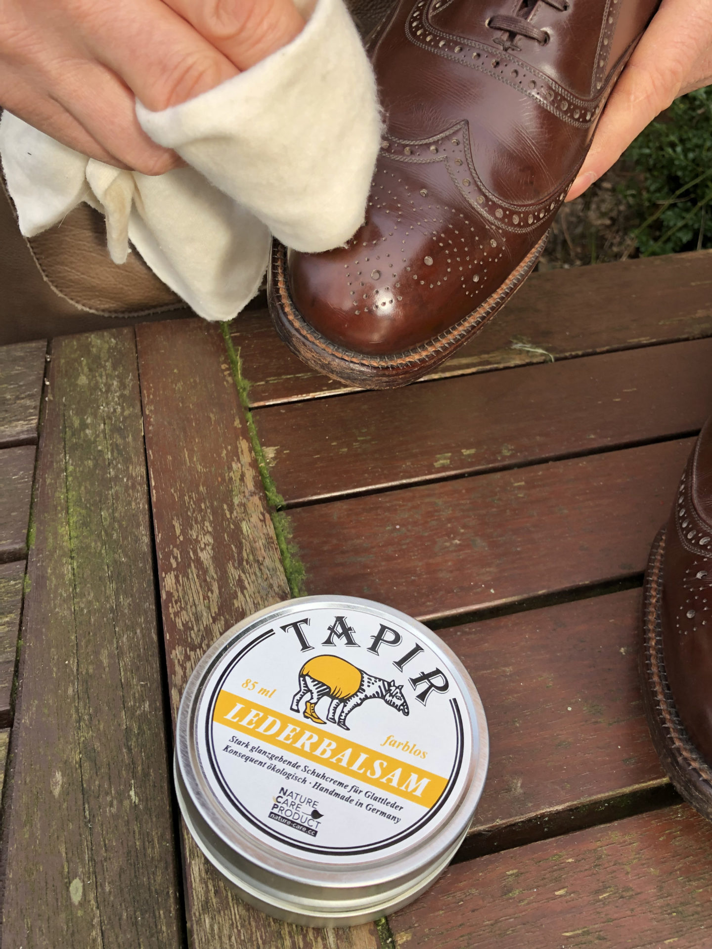 Es gilt: weniger ist mehr! Bitte das Balsam sparsam verwenden, denn es ist sehr ergiebig. Mit wenig Balsam eingecremt und nach einer kurzen Einwirkzeit, kann der Schuh mit einer Tapir Glanzbürste kräftig poliert werden. Die Oberfläche erhält einen schönen Glanz. Die so gepflegten Schuhe können noch mehrmals nachpoliert werden. Erst wenn der Glanz verschwindet, neues Balsam auftragen.