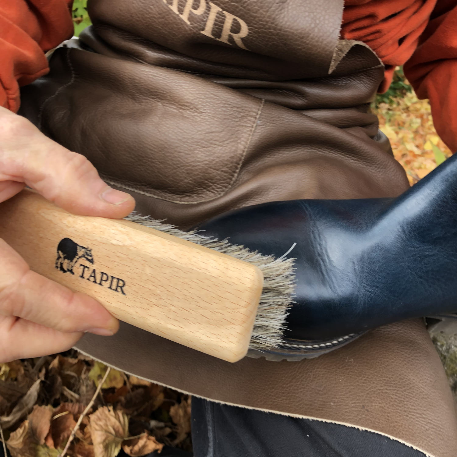 Sobald Ihre Schuhe sauber sind, tragen Sie mit einer Auftragbürste von Tapir unser Lederfett, die Lederpflegecreme oder unser Lederbalsam auf die Oberfläche auf. Mit der Auftragsbürste beginnen Sie nun mit sanften, kreisenden Bewegungen, um die Schuhcreme gleichmäßig zu verteilen und tief in das Leder einzuarbeiten. Achten Sie darauf, alle Bereiche des Schuhs zu behandeln, einschließlich der Nähte und Kanten.