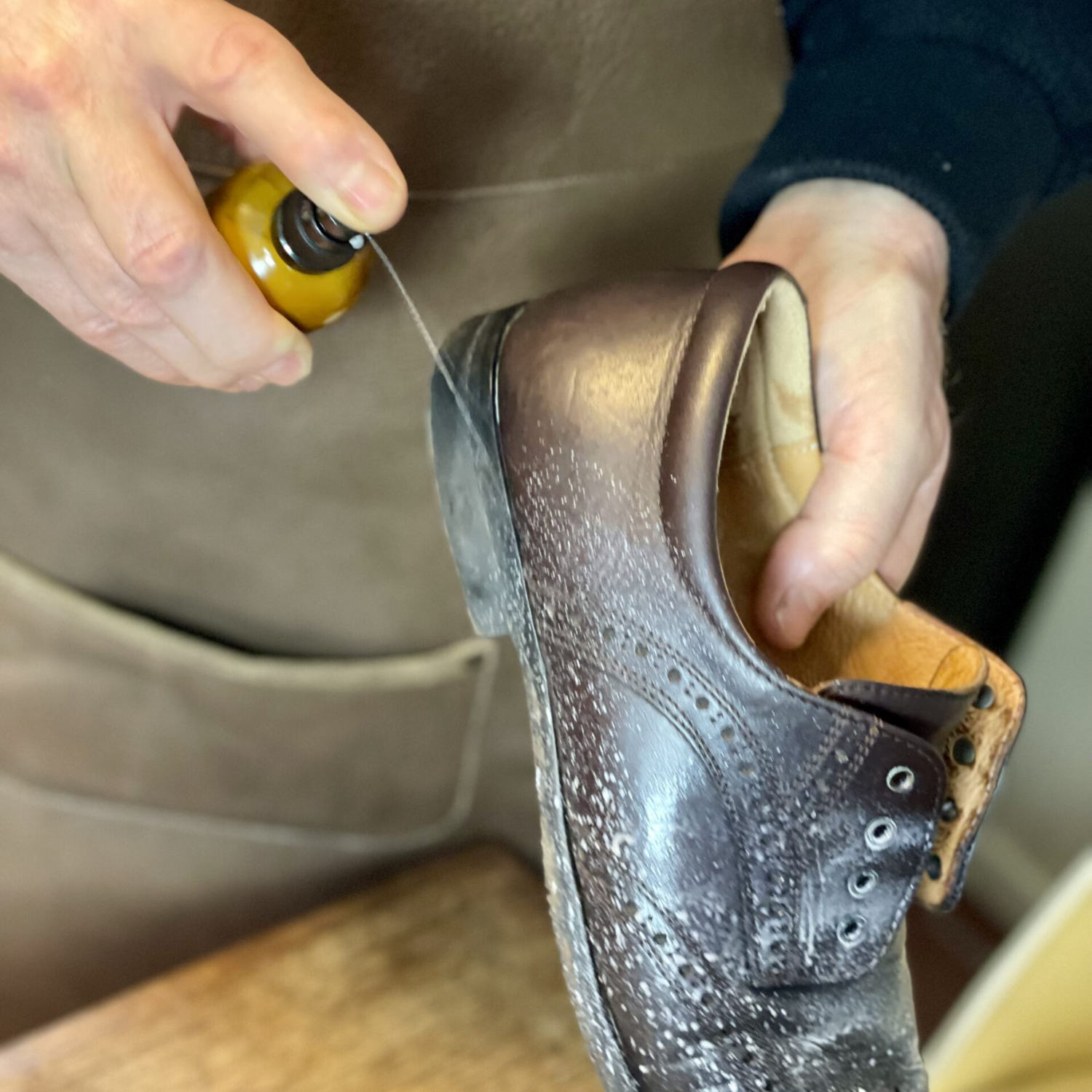 Zunächst die verschmutzten Glattlederschuhe reinigen. Für die Reinigung verschmutzter Schuhe empfehlen wir die Verwendung einer Schmutzbürste oder unsere Tapir Leder- und Sattelseife. Die Lederimprägnierung für Glattleder kann in den feuchten Schuh eingearbeitet werden, aber auch auf dem trockenen Schuh aufgetragen werden. Die Flasche vor Gebrauch gut schütteln. Anschließend die Imprägnierung aus einer Entfernung von etwa 20-30 cm gleichmäßig auf das Leder sprühen. Beachten Sie, dass das Sprühbild nicht immer perfekt gleichmäßig ist und Tröpfchen entstehen können. Diese Tröpfchen sollten sofort mit unserem Tapir Quellschwamm oder einer Tapir Auftragsbürste gleichmäßig auf dem Leder verteilt werden. Lassen Sie das Leder anschließend kurz trocknen. Danach verwenden Sie eine Glanzbürste von Tapir, um das Leder auf Hochglanz zu polieren. Gönnen Sie Ihren Schuhen die bestmögliche Pflege mit unseren hochwertigen Produkten für eine langanhaltende Schönheit und Qualität.