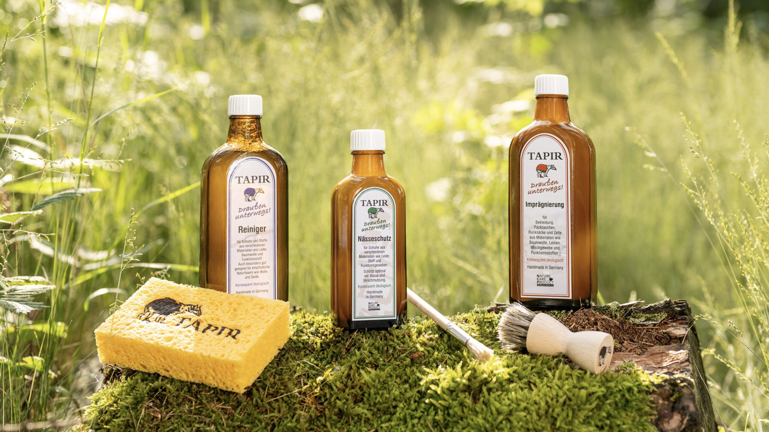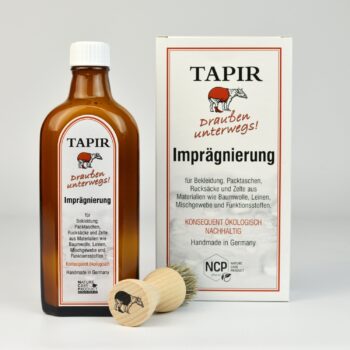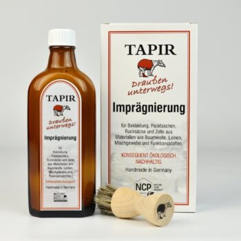 Auch hierfür hat sich Tapir eine Lösung ausgedacht, nämlich die Draußen unterwegs! Imprägnierung. Diese eignet sich für Materialien wie Baumwolle, Leinen, Mischgewebe und Funktionsstoffe und schützt zum Beispiel Kindermatschbekleidung oder großflächigeres wie Packtaschen, Rucksäcke und sogar Zelte vor Feuchtigkeit und Schmutz. Selbstverständlich ist auch diese Imprägnierung konsequent ökologisch und besteht aus vollständig abbaubaren Rohstoffen- zum besseren Schutz für Ihre Habseligkeiten und unsere Umwelt!