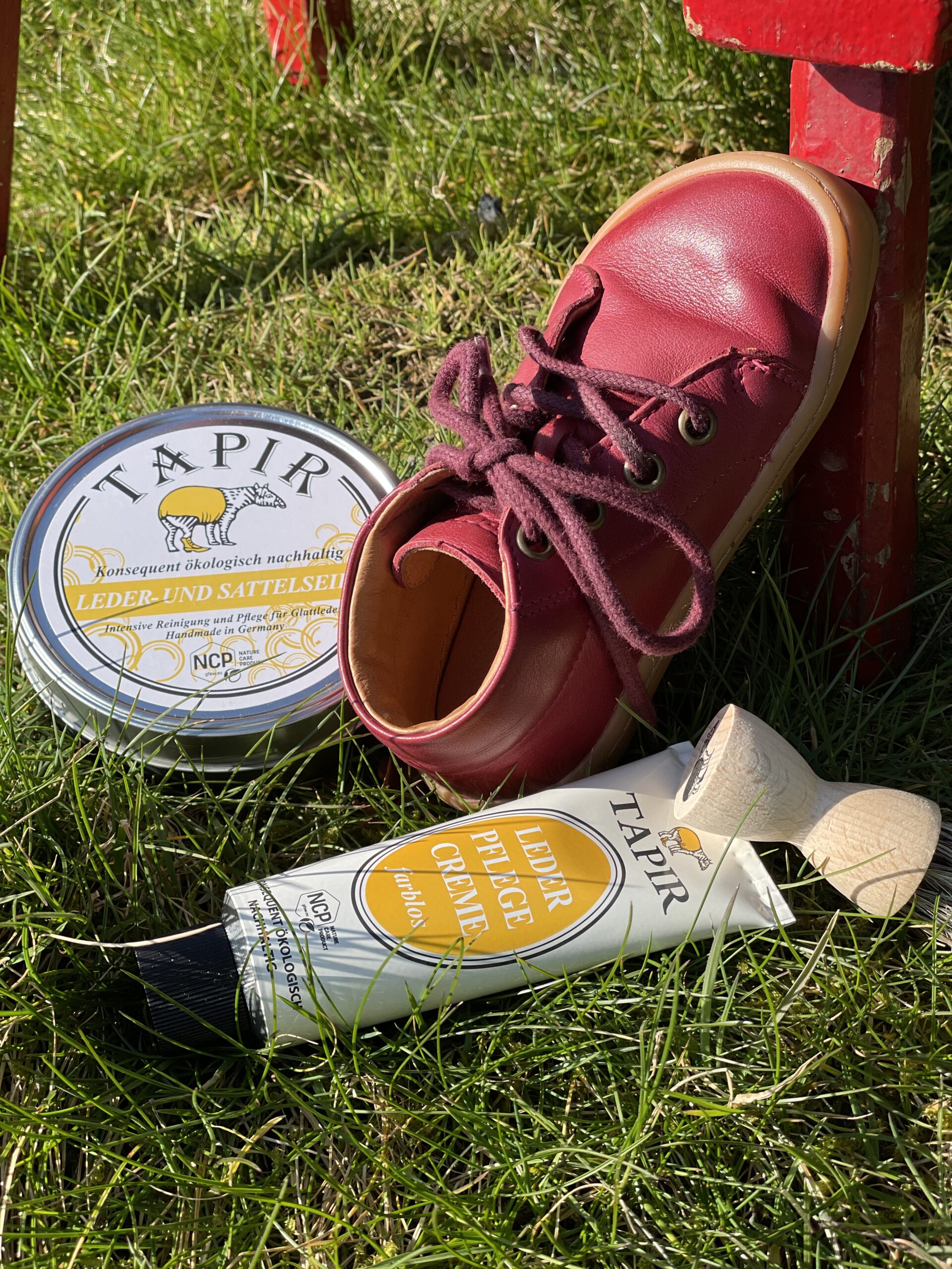 Für die Lederpflege und Auffrischung roter Kinderschuhe aus Glattleder empfiehlt Tapir: