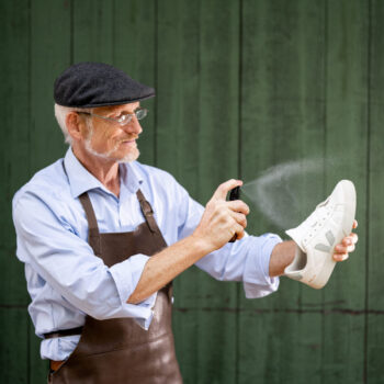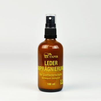 Damit der Schuh auch zukünftig vor Feuchtigkeit und Schmutz geschützt ist, sollte er nun imprägniert werden. Hierfür nehmen wir unsere Imprägnierung für Glattlederschuhe und sprühen sie aus einem Abstand von ca. 10 Zentimetern gleichmäßig auf den Schuh auf.